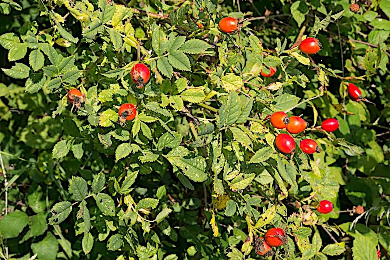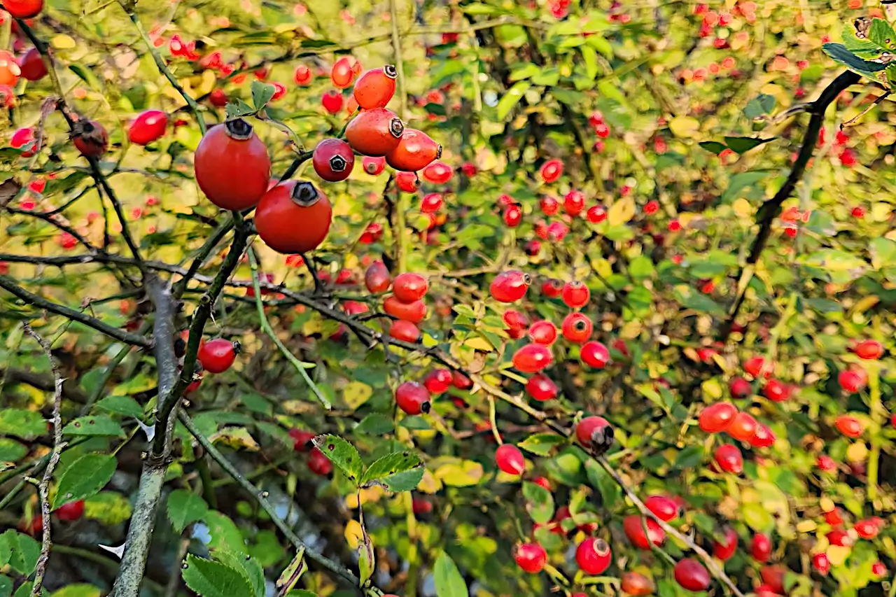 The fruits of the rose hips, commonly known as rose hips, are pseudofruits that are red or orange in color, with an oval or spherical shape. They ripen in autumn, between September and October, and are covered with a thin yet firm skin. Inside, the fruits contain small, hard seeds surrounded by fine, irritating hairs. Rose hips have a slightly tangy taste and are rich in nutrients, which is why they are considered a natural superfood.